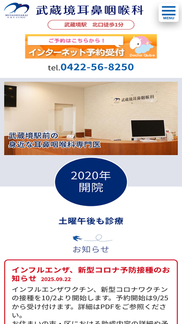 98%武蔵野市境の武蔵境耳鼻咽喉科公式サイト。中央線「武蔵境駅」北口徒歩1分の耳鼻科。土曜午後も診療。南口や三鷹市からもアクセスしやすい立地です。難聴、副鼻腔炎、アレルギー性鼻炎、花粉症、めまい、子供の症状等ご相談ください。