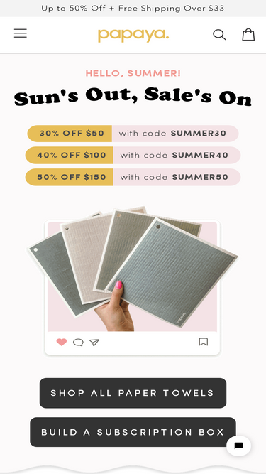 86%Hi, welcome to Papaya! We are a lifestyle brand creating beautiful eco-friendly products that make it exciting to switch to reusables. Gone are the days of deciding between products that look good and products that do good. With Papaya, you get both. All design. Zero waste. We’re just getting started, and we can’t wait