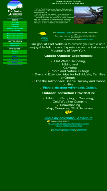 94%Guided Flat Water Canoeing, Hiking and Camping in the Adirondacks. Fort Noble provides Guided outdoor activities throughout the New York State Adirondack Park with N.Y.S. licensed guides. Outdoor skills instruction. Wilderness backcountry treks and Canoe trips. Corprate team building. Confidence building treks for men, women and children.