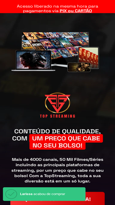 89%Acesso Liberado! Mais de 4000 canais, 50 Mil Filmes/Séries incluindo as principais plataformas de streaming, por um preço que cabe no seu bolso! Com a TopStreaming, toda a sua diversão está em um só lugar.