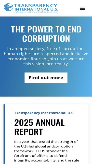 89%We are the United States office of Transparency International, the world’s largest coalition against corruption. We give voices to victims and witnesses of corruption, and work with governments, businesses, and citizens to stop the abuse of entrusted power.