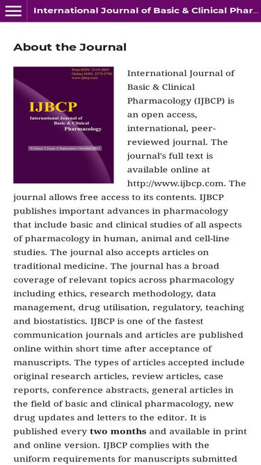 71%international journal of basic & clinical pharmacology (ijbcp) is an open access, international, peer-reviewed journal. the journal's full text is available online at http://www.ijbcp.com. the journal allows free access to its contents. ijbcp publishes important advances in pharmacology that include basic and clinical studies of all aspects of pharmacology in human, animal and cell-line studies. the journal also accepts articles on traditional medicine. the journal has a broad coverage of relevant topics across pharmacology including ethics, research methodology, data management, drug utilisation, regulatory, teaching and biostatistics. ijbcp is one of the fastest communication journals and articles are published online within short time after acceptance of manuscripts. the types of articles accepted include original research articles, review articles, case reports, conference abstracts, general articles in the field of basic and clinical pharmacology, new drug updates and letters to the editor. it is published monthly and available in print and online version. ijbcp complies with the uniform requirements for manuscripts submitted to biomedical journals, issued by the international committee for medical journal editors.