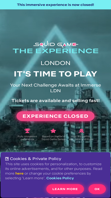 76%An immersive experience based on Netflix's global hit arrives to London. Play iconic Squid Game challenges in real life. Games, Challenges, Korean Delights! Ready to play?