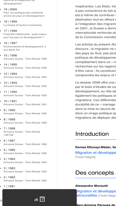 73%le champ d’analyse et de recherche de l’annuaire suisse de politique de développement se trouve au point de rencontre des problèmes globaux (environnement, migrations, sécurité, etc.), des relations nord-sud (coopération au développement, commerce mondial, finance internationale) et des politiques publiques de la suisse. la politique de coopération et l’aide humanitaire de la suisse (bilatérale et multilatérale) avec les pays du sud et de l’est sont au cœur des thèmes abordés par l’annuaire. mais cette approche est largement complétée par l’analyse des débats nationaux dont l’objet a une incidence sur les relations nord-sud, telles les législations sur l’asile et la migration, sur le blanchiment d’argent, la corruption et l’entraide judiciaire, sans oublier les lois relatives à la protection de l’environnement.