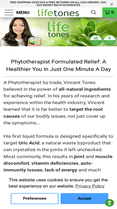 98%Lifetones combines the world's finest ingredients into all-natural formulas designed to target the root cause of bodily aches. Whether you're struggling with gout, arthritis, indigestion, or trouble sleeping...Lifetones can help. Try Lifetones risk-free with our 365-Day, 100% Money-Back Guarantee on every single order.