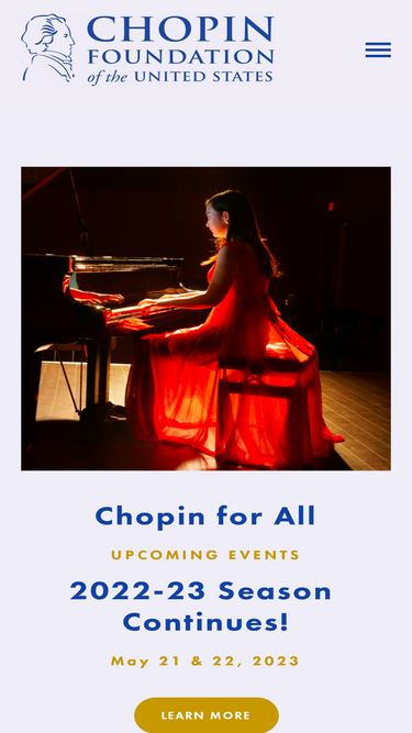 100%The Chopin Foundation’s mission is twofold: to assist young, talented American pianists in their career development and in so doing, open doors to international careers; and to make classical music, especially the music of Frederic Chopin, accessible to everyone.