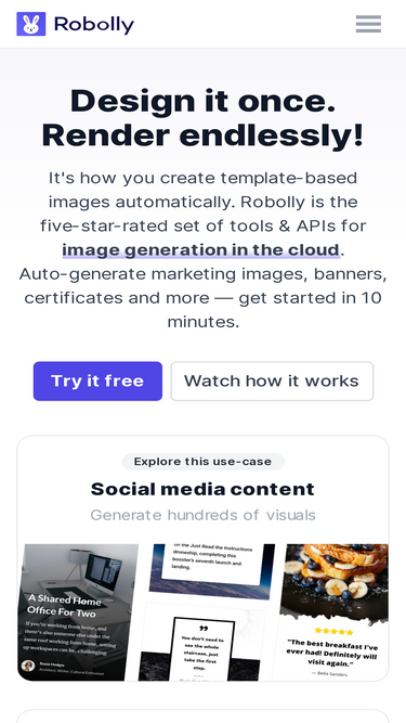 89%use robolly to automatically generate images for social media, promo banners, open graph, pdf certificates, and more.