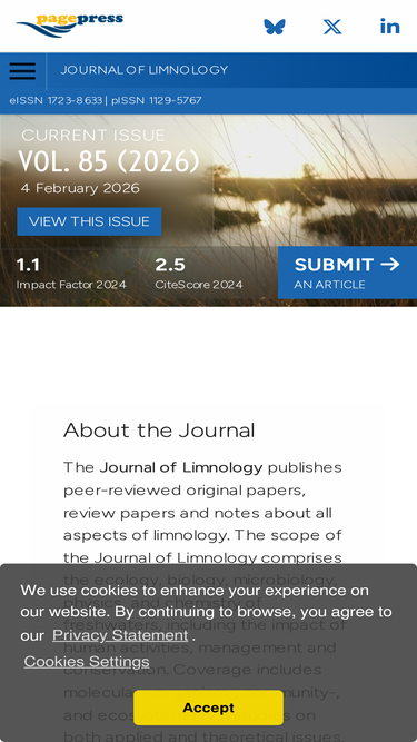 83%the journal of limnology publishes peer-reviewed original papers, review papers and notes about all aspects of limnology.