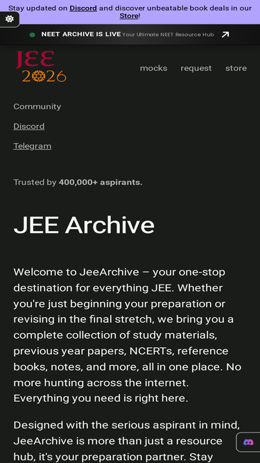 Free JEE preparation resources - Previous year papers, coaching materials, NCERT books, test series, and study notes for Physics, Chemistry & Mathematics.