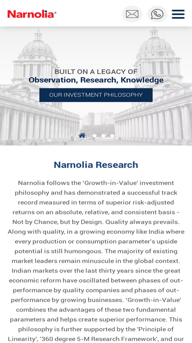 80%narnolia is one of india’s leading research-driven fund management & investment advisory firm in india with world-class financial products and services. we follow the ‘growth-in-value' investment philosophy & aim to deliver superior risk-adjusted returns on an absolute, relative, and consistent basis!