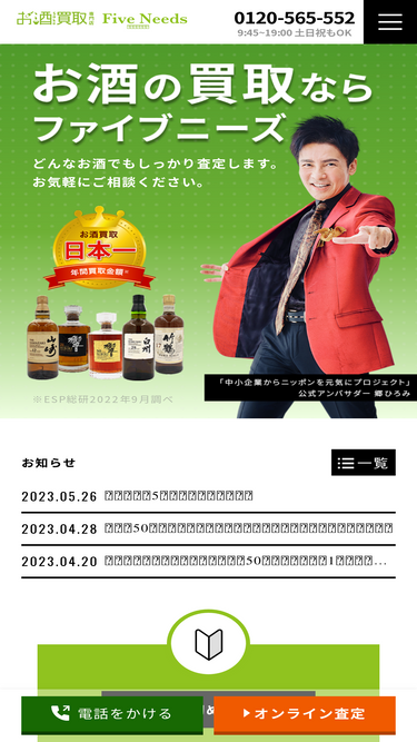 お酒専門で10年以上の実績!お酒の年間買取金額日本一。お酒の売却ならまずはファイブニーズにご相談ください。ウイスキー、ブランデー、ワイン、シャンパン、日本酒、焼酎、中国酒など国産酒・洋酒・古酒問わず、お酒専門の査定員がしっかりと査定し、高価買取いたします。ご納得のいくまでご相談承ります!