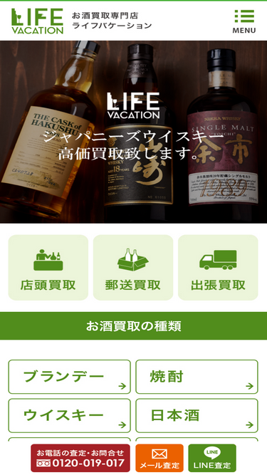73%お酒の査定・買取ならライフバケーションにお任せ下さい。ブランデー・ウイスキー・ワイン・焼酎・日本酒・お酒全般買取致します。実店舗は神奈川県・横浜市、東京都・世田谷区、東京都・千代田区、静岡県、栃木県で営業しております。買取方法は様々で、店頭買取、出張買取、宅配買取などお客様のご都合に合わせて対応させて頂きます。お気軽にお問合せ下さいませ。