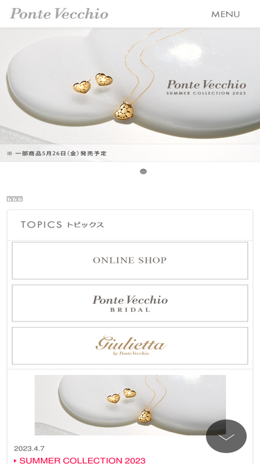100%Ponte Vecchio(ポンテヴェキオ)のオフィシャルサイト。新作コレクションのほか、婚約指輪(エンゲージリング)や結婚指輪(マリッジリング)も幅広く取り揃えております。新着情報、店舗情報、オンラインショップのご紹介をしています。ポンテヴェキオは創業以来、新しいファイン・ジュエリーのスタイルを提案しています。