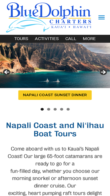 59%blue dolphin operates the two largest catamarans in kauai. we specialize in napali coast boat tours, niihau sightseeing, sunset dinner cruises and more!