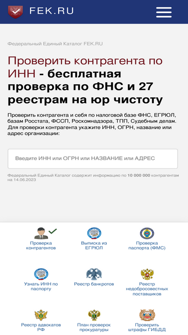 100%Проверить себя и контрагента - официальный сайт для бесплатной онлайн проверки контрагента по ИНН в налоговой ФНС и реестре FEK, а так же полной проверки компании по 36 базам и источникам, аналог сервиса Контур фокус, Спарк интерфакс, Сбис и за честный бизнес
