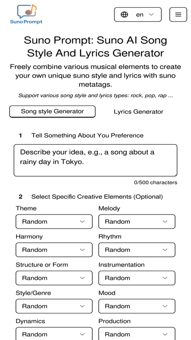 93%Generate song and lyrics with suno metatags and music style: rock lyrics, pop lyrics, etc. suno ai prompts, lyrics and udio lyrics