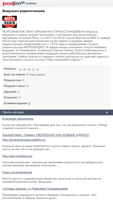 82%Популярная музыка ассоциируется прежде всего с английский языком, но есть целые пласты музыки на других языках, таких как: итальянский, испанский , немецкий и прочие. Эта программа посвящена популярной франко-язычной музыке. Автор и ведущий программы, известный петербургский коллекционер и популяризатор этой музыки, открывает для нас имена самобытных, знаменитых и популярных у себя на родине во Франции, исполнителей и знакомит слушателей с их музыкой. В связи с сменой бренда подкасты программ коллектива радиостанции теперь размещаются по новому адресу ссылка