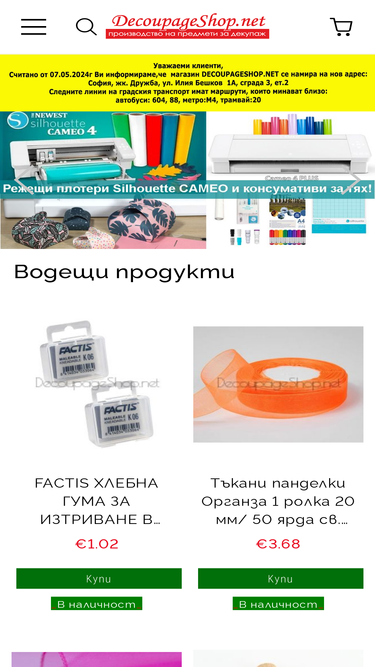 74%Описание CAMEO 5α е мощен хоби плотер, подходящ както за начинаещи, така и за опитни творци, осигуряващ интуитивно потребителско изживяване, като същевременно поддържа висока прецизност и производителност. Като най-бързата машина в линията Silhouette, CAMEO 5α предлага максимална скорост от 400 мм/сек, което позволява по-бързо производство без компромис с точността. Пълно продуктово описание, наръчник на потребителя и сравнителна таблица на различните модели плотери Silhouette може да намерите в секцията "Файлове". Хоби плотерите Silhouette не са предназначени за професионална работа и интензивно натоварване! Гаранцията не покрива повреди, дължащи се на неправилна употреба. Технически характеристики Зона за рязане 30.5 cm x 61.0 cm — с подложка 29.5 cm x 487.7 cm — без подложка Максимална дебелина на материала 3 mm Максимална скорост на рязане 300 mm/s Максимална скорост на скициране 400 mm/s Четене на регистрационни маркери Да Система за регистрационни маркери (4 точки) Да Автоматично регулиране (AutoBlade тип B) Да Интерфейси USB 2.0 / Bluetooth® Номинално захранване AC адаптер DC 24V (1.25A) Консумирана мощност 25 W Работна среда 10–35 °C, 35–75% RH (без конденз) Гарантирана работна среда 16–32 °C, 35–70% RH (без конденз) Размери на устройството 56.6 x 17.6 x 12.4 cm Тегло на единица 5.20 kg Размери за доставка 63.0 x 27.3 x 21.0 cm Тегло за доставка 6.26 kg Изисквана версия на Silhouette Studio® 5.0.402 или по-висока Минимални системни изисквания Windows 10+, macOS 13+ Стандарт за безопасност (Европа) IEC 62368-1:2018 Предимства Възможност за рязане без подложка Съвместим със Silhouette Power Tools Автоматично разпознаване на инструменти Лесно регулируеми притискащи ролки за по-плавно регулиране и подобрена видимост за прецизна настройка Автоматичен нож AutoBlade (тип B) По-тиха работа Плавна архитектура на отварящия се капак Електростатична постелка (допълнителен аксесоар като опция) Нова подсилена приставка за подаване на ролка (допълнителен аксесоар) П