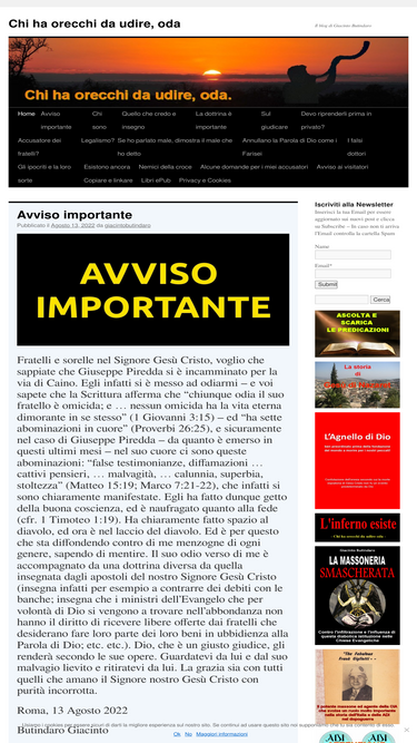 99%Poiché io non mi vergogno dell’Evangelo; perché esso è potenza di Dio per la salvezza d’ogni credente; del Giudeo prima e poi del Greco. (Romani 1:16) Mi chiamo Illuminato Butindaro, ho 48 anni e…