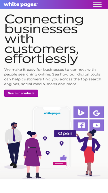 100%Over 2.1 million people use the White Pages Network to make over 6.7 million searches a week. Reach them with a White Pages business account across our website, app, voice services and print directory....