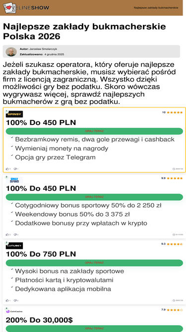 100%Najlepsi bukmacherzy w Polsce to firmy z licencją offshore. Sprawdź ranking bukmacherów i obstawiaj zakłady bukmacherskie bez podatku.