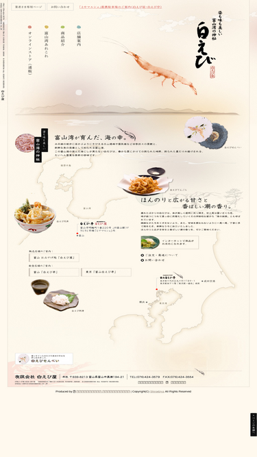 88%白えびは厳しい日本海の荒波にもまれた海産物は、富山県が誇る特産品のひとつです。特に富山ならではの味覚で、お刺身、素干し、ちょい辛焼はお酒との相性もよく、酒の肴としては最高です