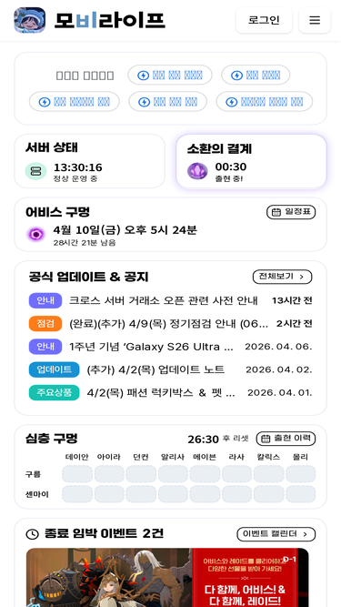 모비노기 (마비노기 모바일) 통합 순위 검색, 전 서버 인구 통계, 전 서버 실시간 랭킹, 룬 도감, 룬 티어 검색, 숙제 도우미 트래커, 채집 지도, 악보 제작 도우미 / 전 서버 통합 랭킹, 전투력/매력/생활력 순위, 서버 인구 통계, 진행중인 이벤트 정보와 공지사항 대시보드