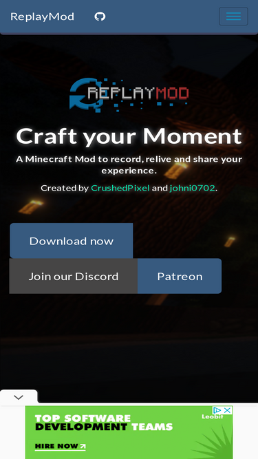 78%the official website for the minecraft replay mod, a modification to allow players to record their game sessions and replay them from any perspective.