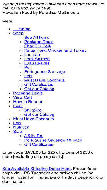 order our hawaiian food made fresh when you order and shipped from hawaii. kalua pork, poi, lau lau, portuguese sausage, kalua pig, lomi and more