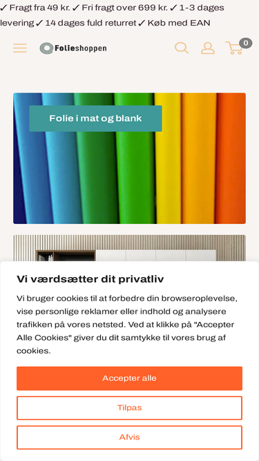 88%Folie er en genial måde at opfriske dit køkken på, hvis du ikke vil investerer i et helt nyt køkken. Stort udvalg af folie til køkkenlåger, fås i blank og mat samt i 31 forskellige farver.Selvklæbende Folie til køkkenlåger er en mulighed, hvis du ønsker at forny dit køkken, uden at bruge en masse penge. Hos folieshoppen.dk kan du bestille dit folie til køkkenlåger i de mål, du ønsker – helt ned til millimeter. Så ingen spild, og du betaler kun for det folie, du reelt skal bruge. Vi kan også tilbyde sokkelfolie – Se mere her. Folie til køkkenlåger er også en god løsning for dig, der bor til leje, og er træt af dit nuværende køkken. Folien kan nemt afmonteres igen, når du flytter ved at varme den op med en føntørrer. Eventuelle rester af lim kan fjernes med rensebenzin.Bestil køkkenfolie Til Låger OnlineStart med at måle de flader i dit køkken som du vil dække med folie.Vælg farve på folienvælge om folien skal være mat eller blank.Vælg derefter om du vil have folien skåret på mål, eller du vil have stykker med bredder på hhv. 126 eller 63 cm.Har du valgt fast bredde, kan du nu vælge længden på din folie. Har du valgt skåret på mål, udfylder du blot længde og bredde på det stykke du skal bruge.Du vælger nu hvor mange stykker du skal bruge, i den valgte størrelse.Vær opmærksom på at rullebredden på folien er 126 cm, så bestiller du bredere bliver det leveret i flere stykker. F.eks. vil 2x2 m blive delt op i to stykker.Frisk dine fliser op med folie – Læs mere herMontering af folie på køkkenlågerDu modtager folien tilskåret i den størrelse, du har valgt og herefter kan du gå i gang med at montere folien i dit køkken. Du får det bedste resultat ved at spraye vand indeholdende lidt sulfo/opvaskemiddel direkte på den flade hvor folien skal sidde. Herefter overfører du folien til fladen og bruger en plasticskraber til at få et helt jævnt resultat.InfoHoldbarhed: Indendørs montage: UbegrænsetTykkelse: 70/80 myMonteringstemperatur: +10 gr.Demontering: Kan med fordel ske ved hj