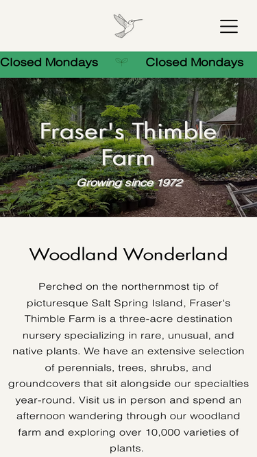 91%Established in 1972 and driven by the passion of owner-operators Richard and Nancy Fraser, Fraser's Thimble Farms has spent over 50 years growing from a simple plant stand selling flowers into the woodland specialty farm it is today.