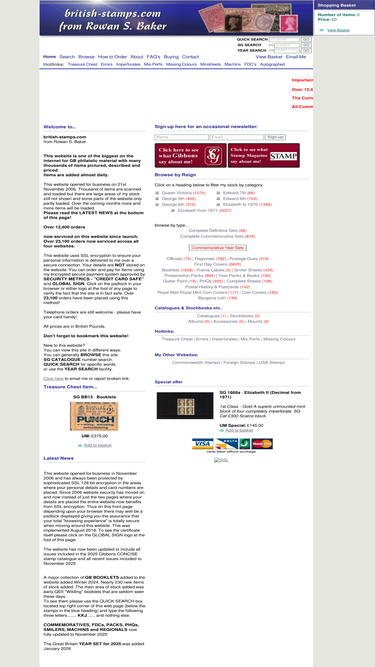 100%an exceptional selection of british stamps currently available from stock in the following categories; all reigns, complete definitive sets, complete commemorative, commemorative year sets, officials, regionals, postage dues, first day covers, coin covers, booklets, frama labels, smiler sheets and postal history together with a selection of treasure chest items, errors, mis-perfs, imperofates and missing colours items. the stock currently runs to well over 3000 items!