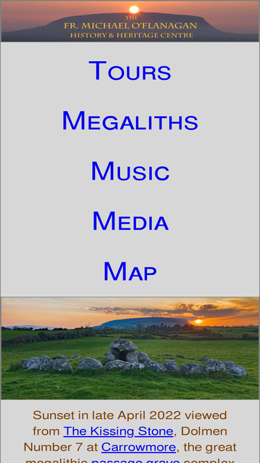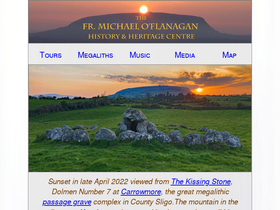 99%homepage of the extensive website devoted to the culture, history, archaeology, landscape and traditional music of ireland, dedicated to the memory of father michael o'flanagan, priest, politician, hostorian and inventor. the website, which was started in 1998, is run and maintaned by fáilte ireland approved guide martin byrne and his wife margaret, a pair of noted traditional musicians and tour guides based in the father o'flanagan history and heritage centre in the old ric barracks in cliffoney village, county sligo. both margaret and martin play tunes within and as part of each tour. they also perform house concert duets which include a wide range of instruments and sounds: gaelic medieval wire-strung harp, fiddles, whistles, banjos and uilleann pipes, and the history and stories behind the tunes.