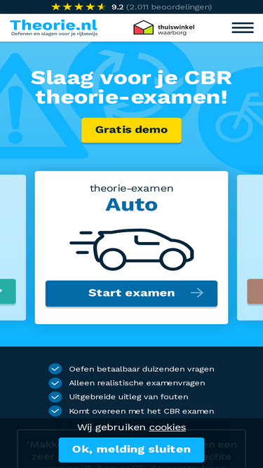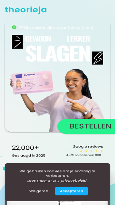 90%Oefen voor je theorie examen met Theorieja. Interactieve vragen, echte examensimulaties en expert tips om je rijbewijs in één keer te halen.