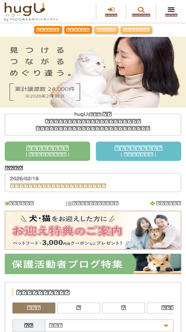 hugU(ハグー)は、ペット(犬・猫・小動物など)の里親募集者と里親応募者をつなぐ「ペットの里親マッチングサイト」です。さまざまな事情から、新しい飼い主との出会いを待っているペットが多数掲載されています。里親になりたいと思っている方はぜひご覧ください。みんなのペットオンライングループは、日本全国すべてのペットが終生幸せに生きていくためのお手伝いをしています。