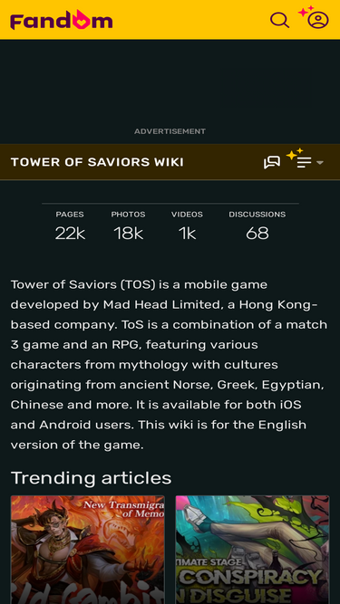 57%tower of saviors (tos) is a mobile game developed by mad head limited, a hong kong-based company. tos is a combination of match 3 game and rpg, featuring elements of the ancient mythology varying from greece, china, egypt and more. it is available for both ios and android users. its traditional chinese version has successfully made it into the hong kong and taiwan mobile market.