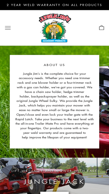 94%Jungle Jim's Accessory Products is your one stop shop for low-cost, easy-to-use accessories for professionals in the lawn care industry. We make trimmer racks, sulkies, blower holders, trailers, transport lockdowns and more. 2-year weld warranty on all products. High-quality products at affordable prices.