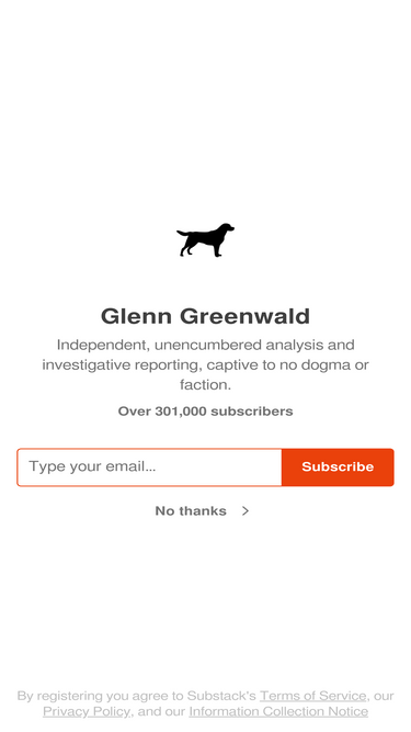 98%Independent, unencumbered analysis and investigative reporting, captive to no dogma or faction. Click to read Glenn Greenwald, a Substack publication with hundreds of thousands of subscribers.