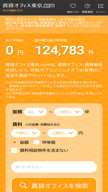 85%賃貸オフィス東京.comは、賃貸オフィス・賃貸事務所の不動産検索サイトです。物件紹介に加え、事務所の移転のプランニングまでお客様のご要望を徹底サポートいたします。40坪以上の全物件仲介手数料無料でご安心いただけますので是非一度ご覧ください。