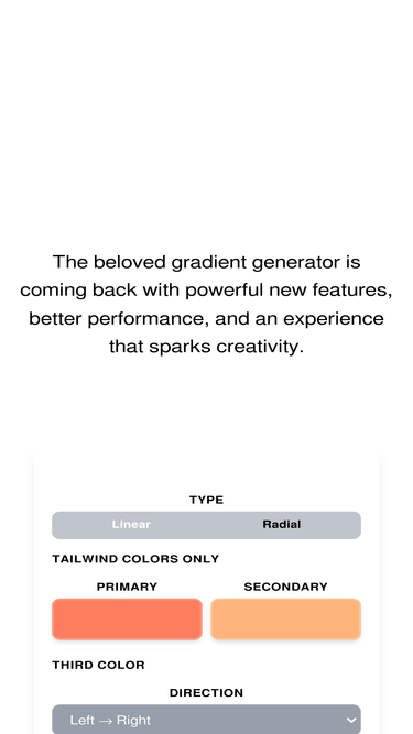 75%The best collection of beautiful, ready-to-use Tailwind CSS gradients. Copy and paste perfect gradient classes for your next project.