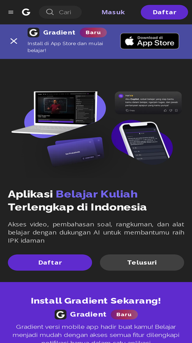 86%Situs belajar online membantu Kamu meningkatkan pengetahuan dan keterampilan dalam memahami setiap materi perkuliahan melalui kelas & latihan soal yang interaktif.