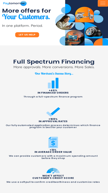 87%increase your sales by offering paytomorrow as a financing option for your customers. contact us to learn more about our financing options.