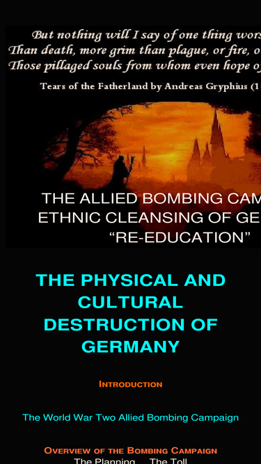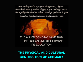 25%detailed catalog of the allied terror-bombing campaign against germany during the second world war. more bombs were dropped on berlin alone than the whole of britain. many ancient cathedrals, churches and medieval castles were destroyed by british and american air attacks during the final weeks of the war, spitefully using the opportunity of germany’s defeat to obliterate its cultural heritage. the ethnic cleansing, forced labor and genocide of germans immediately after the war is also described.