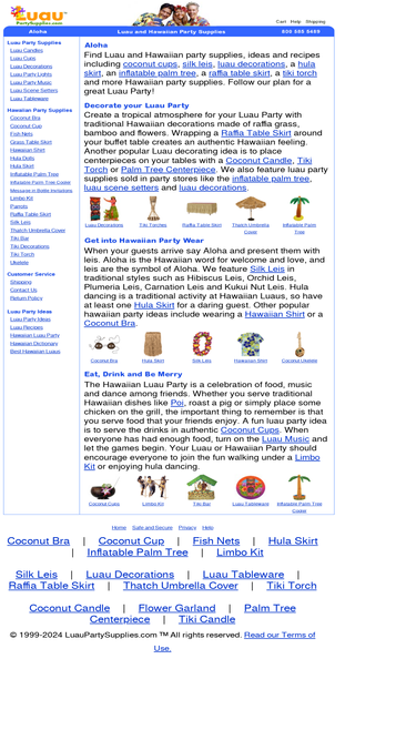 100%find luau and hawaiian party supplies, ideas and recipes including coconut cups, silk leis, luau decorations, hula skirts, raffia table skirts and tiki torch.