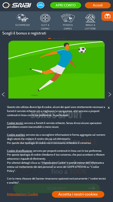 99%Registrati su SNAI e ricevi subito 5€ Free più 300€ fare le tue scommesse sportive, i giochi da casinò e le slot online. In più trovi sempre nuove promozioni per divertirti con giochi e scommesse online.