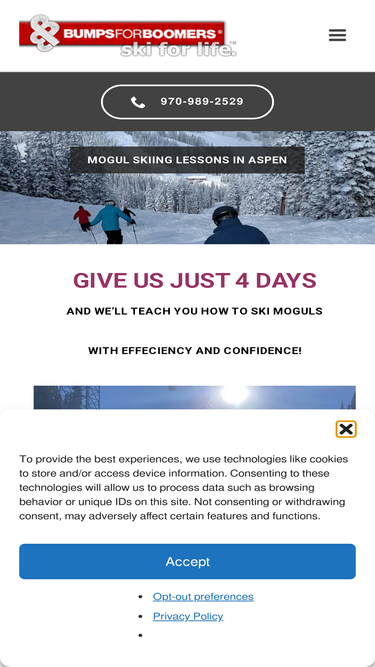 85%A photo gallery showing a sample of of clients who have taken a Bumps For Boomers mogul ski lesson clinic or Bumps For Boomers private lesson.