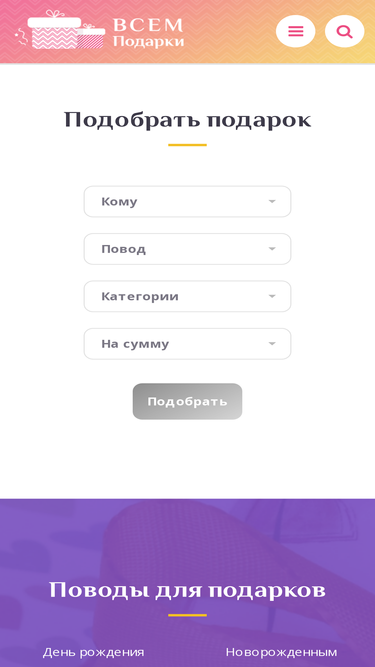 быстрый и легкий выбор подарка по поводу, цене, получателю и его интересам.