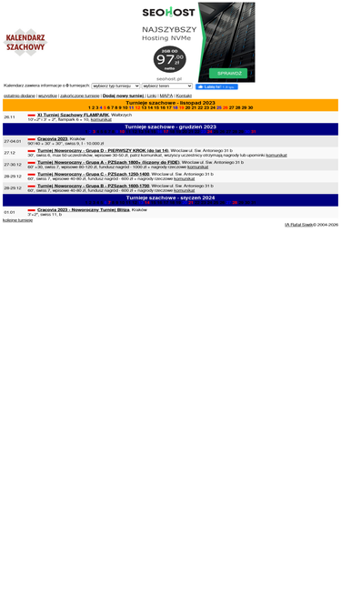 97%lista turniejów szachowych z podziałem na miesiące. komunikaty i linki do stron www. możliwość filtrowania wg tempa gry, miejsca. dodaj swój turniej!