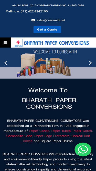 100%Coresmith.net is manufacturers and exporters of high quality paper tubes and cores, paper cones, textile paper cones, paper edge protectors, composite cans, conical bolt boxes and paper angle boards in India, Coimbatore. We are the leading Paper Converting unit in India with the latest model machinery and an experienced, dedicated team of staff and workers.