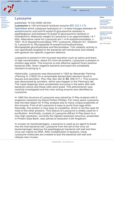65%chicken egg white lysozyme. enzymatic activity, sequence, crystallization and 3d structure of this enzyme.